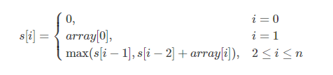按照第 i 个元素是否被选取,前 i 个元素的和要么与前 i−1 个元素的和相同(不选取),要么是前 i−2 个元素的和加上此第 i 个元素(选取),这两种情况取最大。这很容易通过递归实现出来,也可以使用动态规划实现。要用动态规划,子问题的选取需要具有无后效性,即前 i 个元素的选取只能和之前的选取有关,和未来的情况无关。对于数组array[i],i=0∼n−1,定义 s[i] 表示前 i 个元素的最大和,则递归式为