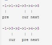 pre 和 next 分别指向要翻转的链表的前后的位置,然后翻转后 pre 的位置更新到如下新的位置