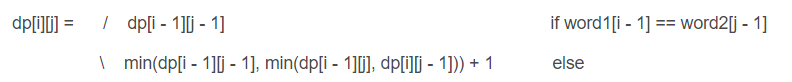 解法:dp[i][j] 表示从 word1 的前i个字符转换到 word2 的前j个字符所需要的步骤。当word1[i] == word2[j]时,dp[i][j] = dp[i - 1][j - 1],其他情况时,dp[i][j]是其左,左上,上的三个值中的最小值加1,其实这里的左,上,和左上,分别对应的增加,删除,修改操作,转移方程如下: